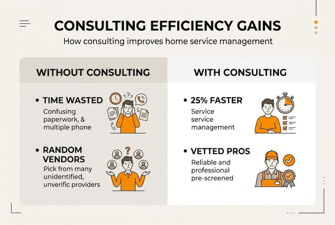 | Consulting boosts efficiency | Homeowners can achieve up to 25% productivity gains and faster service completion through consulting. |