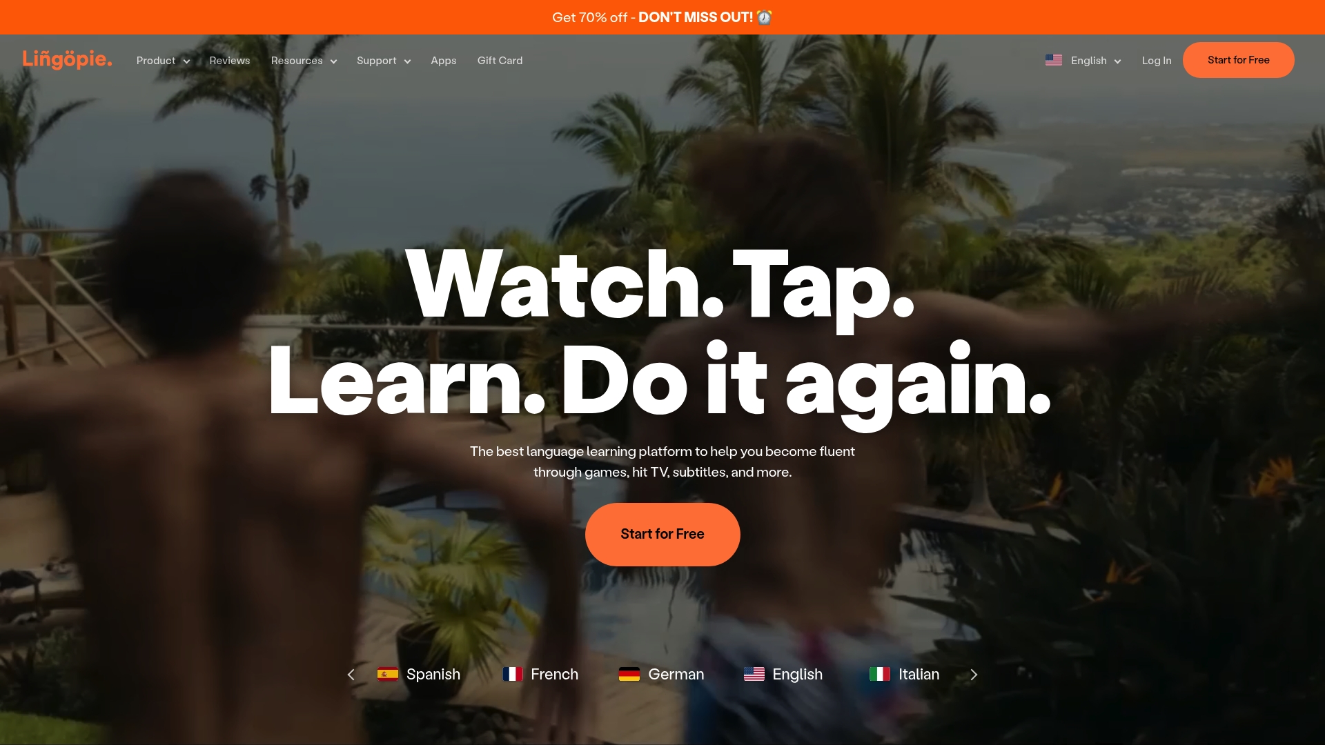 Lingopie delivers real world content across TV shows, movies, music videos, podcasts, and books while providing interactive subtitles that let you click to translate and save vocabulary. The platform includes flashcards, quizzes, pronunciation coaching, and supports 15 languages on phones, tablets, computers, and smart TVs.